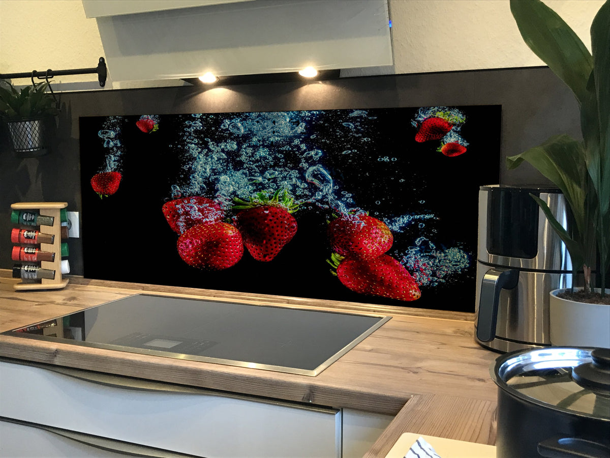 Verleihen Sie Ihrer Küche mit der Spritzschutz Küche Erdbeeren im Wasser von Rueckwand21 einen stilvollen und modernen Look, der Ihre Persönlichkeit widerspiegelt. Passen Sie die Rückwand genau an Ihre Küche an – einfach Maße eingeben und den gewünschten Motivausschnitt auswählen – und schon ist Ihr neues Küchendesign fertig!