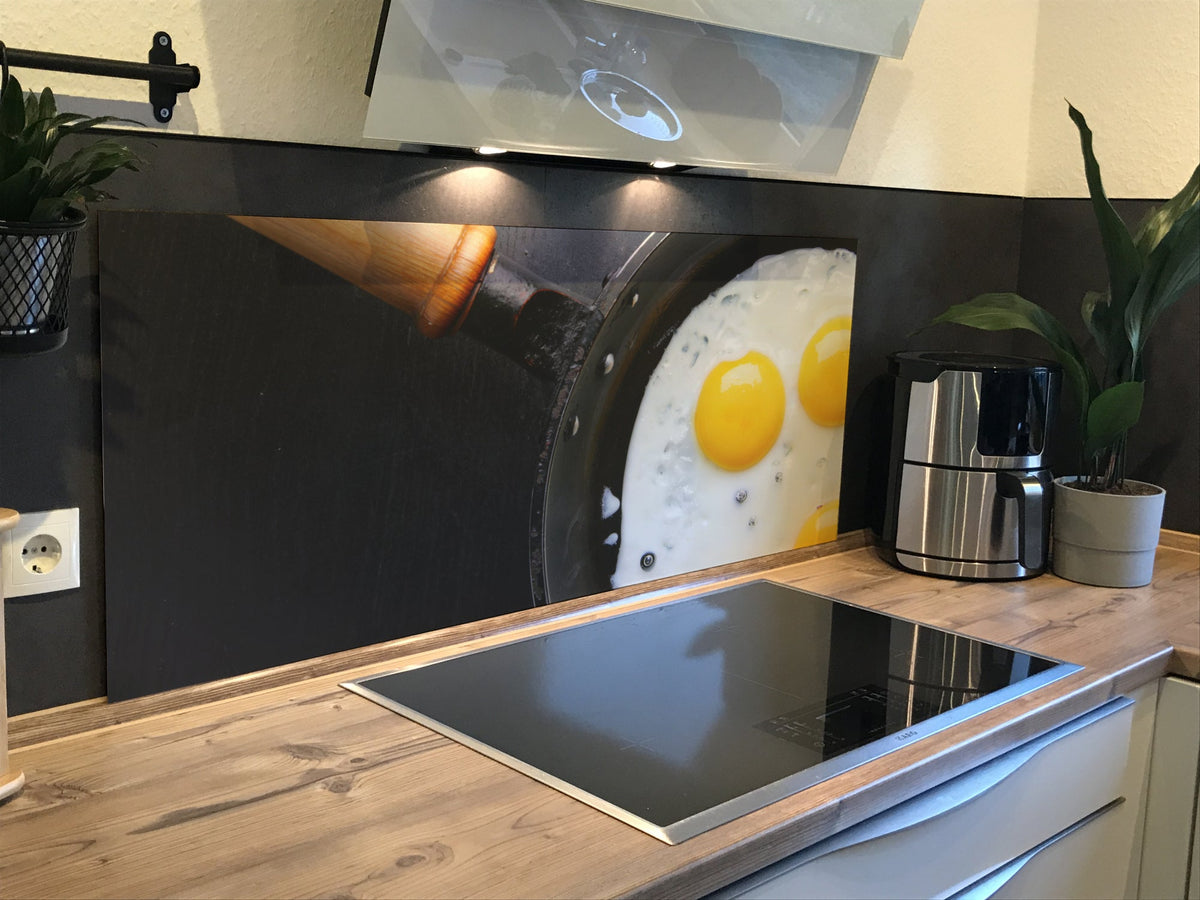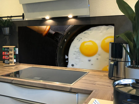 Verleihen Sie Ihrer Küche mit der Spritzschutz Küche Spiegelei von Rueckwand21 einen stilvollen und modernen Look, der Ihre Persönlichkeit widerspiegelt. Passen Sie die Rückwand genau an Ihre Küche an – einfach Maße eingeben und den gewünschten Motivausschnitt auswählen – und schon ist Ihr neues Küchendesign fertig!