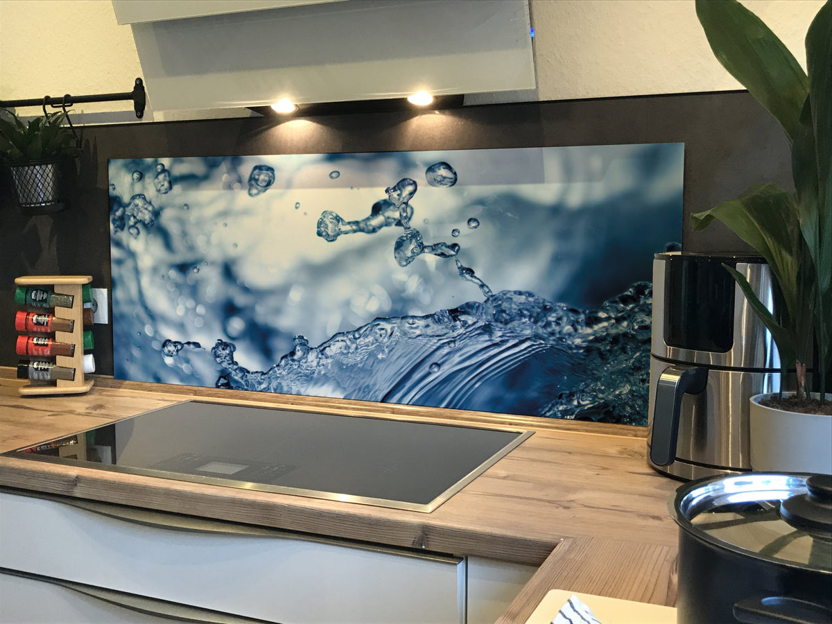 Verleihen Sie Ihrer Küche mit der Spritzschutz Küche Wasser Splash von Rueckwand21 einen stilvollen und modernen Look, der Ihre Persönlichkeit widerspiegelt. Passen Sie die Rückwand genau an Ihre Küche an – einfach Maße eingeben und den gewünschten Motivausschnitt auswählen – und schon ist Ihr neues Küchendesign fertig!