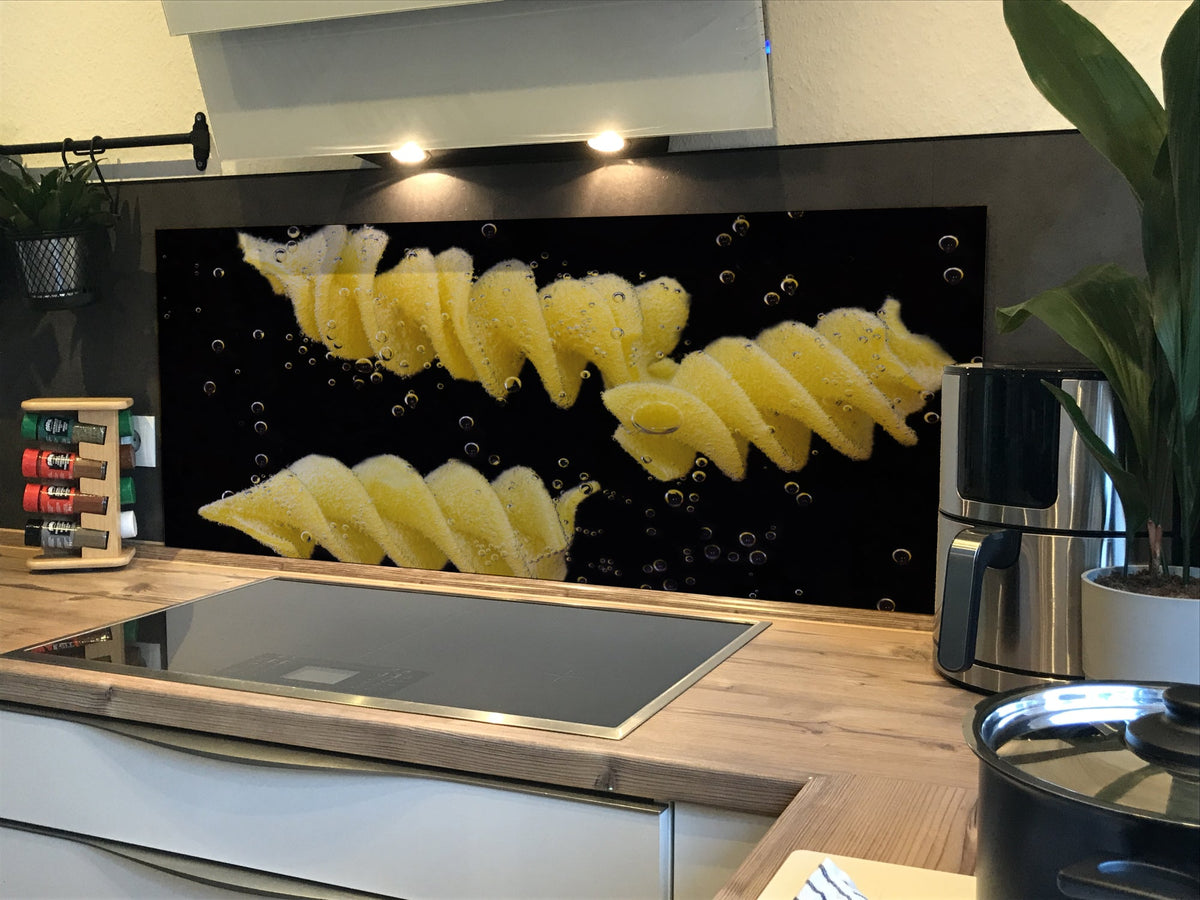 Verleihen Sie Ihrer Küche mit der Spritzschutz Küche Nudel unter Wasser von Rueckwand21 einen stilvollen und modernen Look, der Ihre Persönlichkeit widerspiegelt. Passen Sie die Rückwand genau an Ihre Küche an – einfach Maße eingeben und den gewünschten Motivausschnitt auswählen – und schon ist Ihr neues Küchendesign fertig!