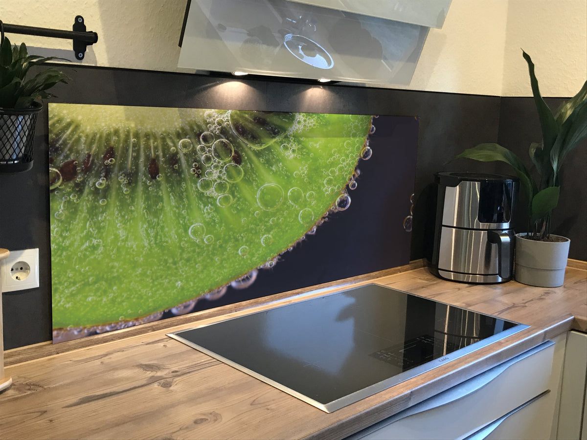 Verleihen Sie Ihrer Küche mit der Spritzschutz Küche Kiwi Sprudel von Rueckwand21 einen stilvollen und modernen Look, der Ihre Persönlichkeit widerspiegelt. Passen Sie die Rückwand genau an Ihre Küche an – einfach Maße eingeben und den gewünschten Motivausschnitt auswählen – und schon ist Ihr neues Küchendesign fertig!