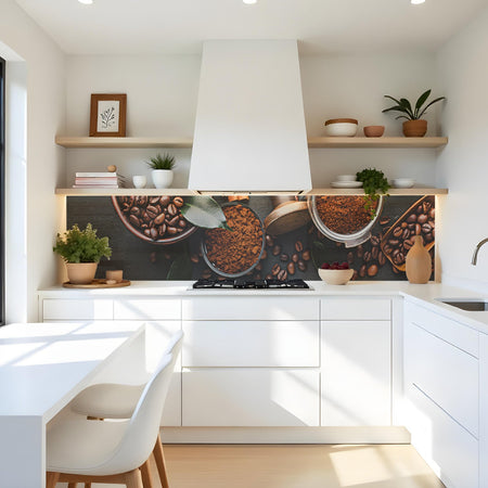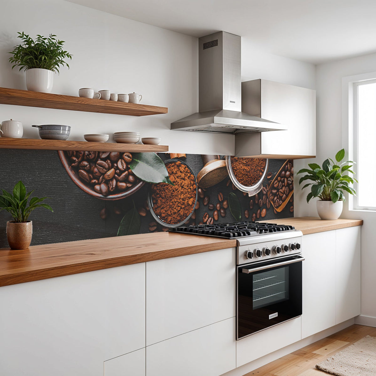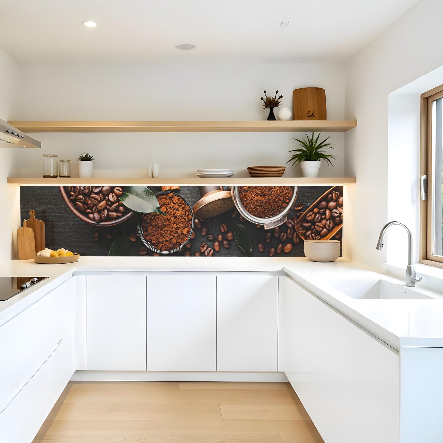 Verleihen Sie Ihrer Küche mit der Küchenrückwand Kaffee von Rueckwand21 einen stilvollen und modernen Look, der Ihre Persönlichkeit widerspiegelt. Passen Sie die Rückwand genau an Ihre Küche an – einfach Maße eingeben und den gewünschten Motivausschnitt auswählen – und schon ist Ihr neues Küchendesign fertig!