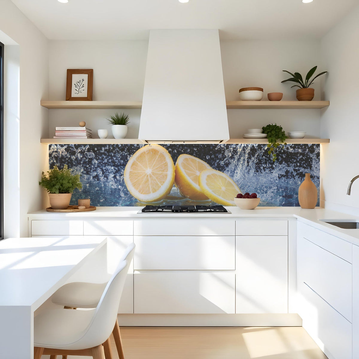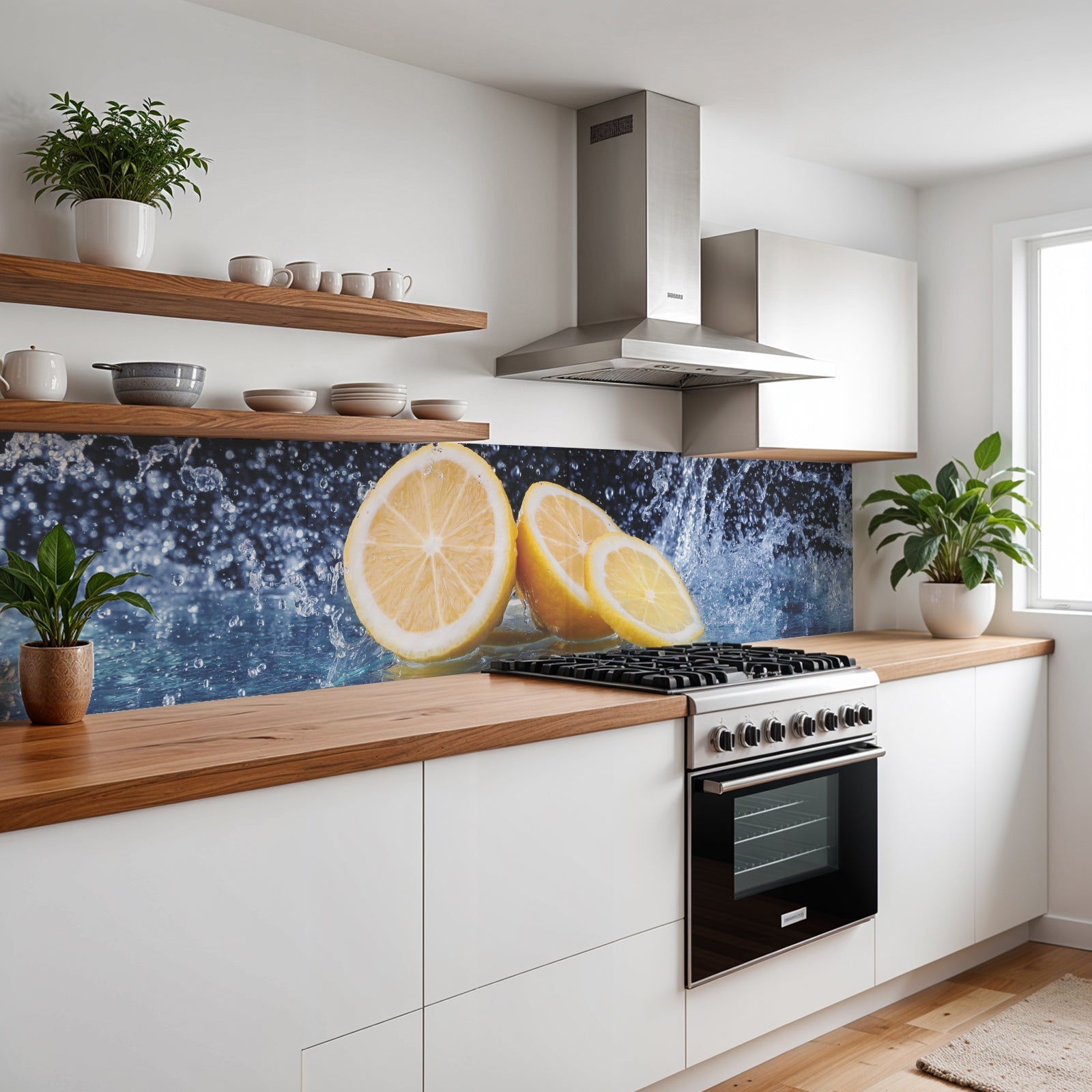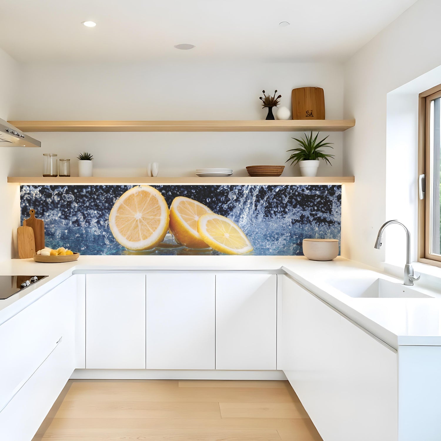 Verleihen Sie Ihrer Küche mit der Küchenrückwand Zitronen Wasser von Rueckwand21 einen stilvollen und modernen Look, der Ihre Persönlichkeit widerspiegelt. Passen Sie die Rückwand genau an Ihre Küche an – einfach Maße eingeben und den gewünschten Motivausschnitt auswählen – und schon ist Ihr neues Küchendesign fertig!