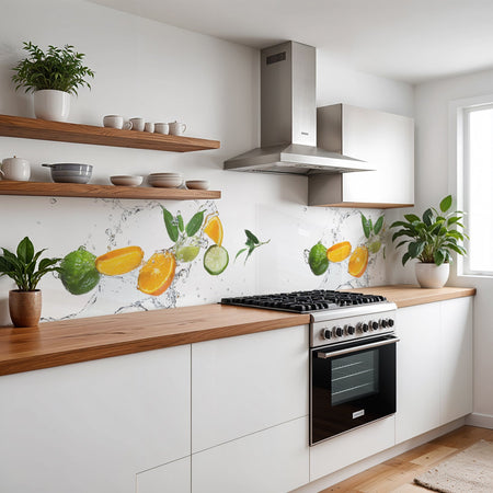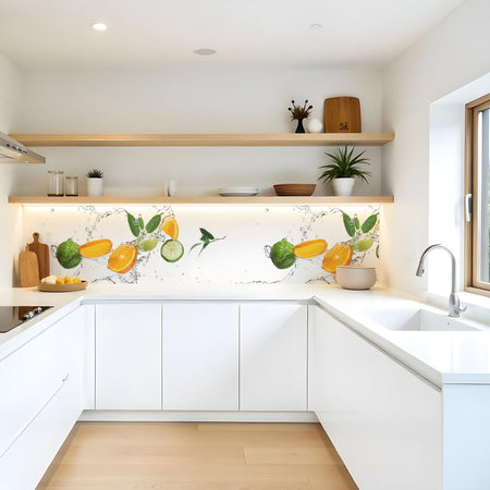 Verleihen Sie Ihrer Küche mit der Küchenrückwand Zitrusfrüchte mit Wassersplash von Rueckwand21 einen stilvollen und modernen Look, der Ihre Persönlichkeit widerspiegelt. Passen Sie die Rückwand genau an Ihre Küche an – einfach Maße eingeben und den gewünschten Motivausschnitt auswählen – und schon ist Ihr neues Küchendesign fertig!