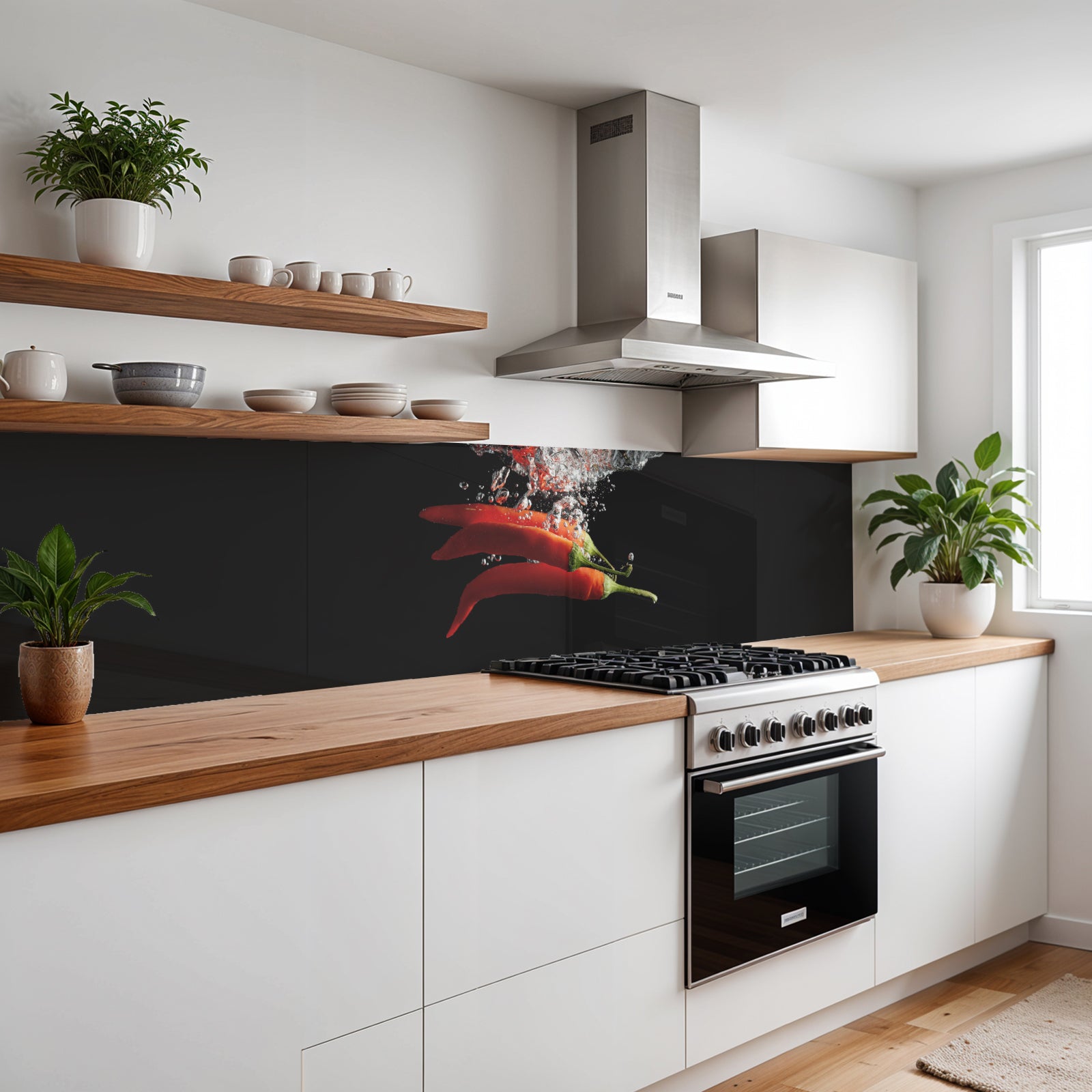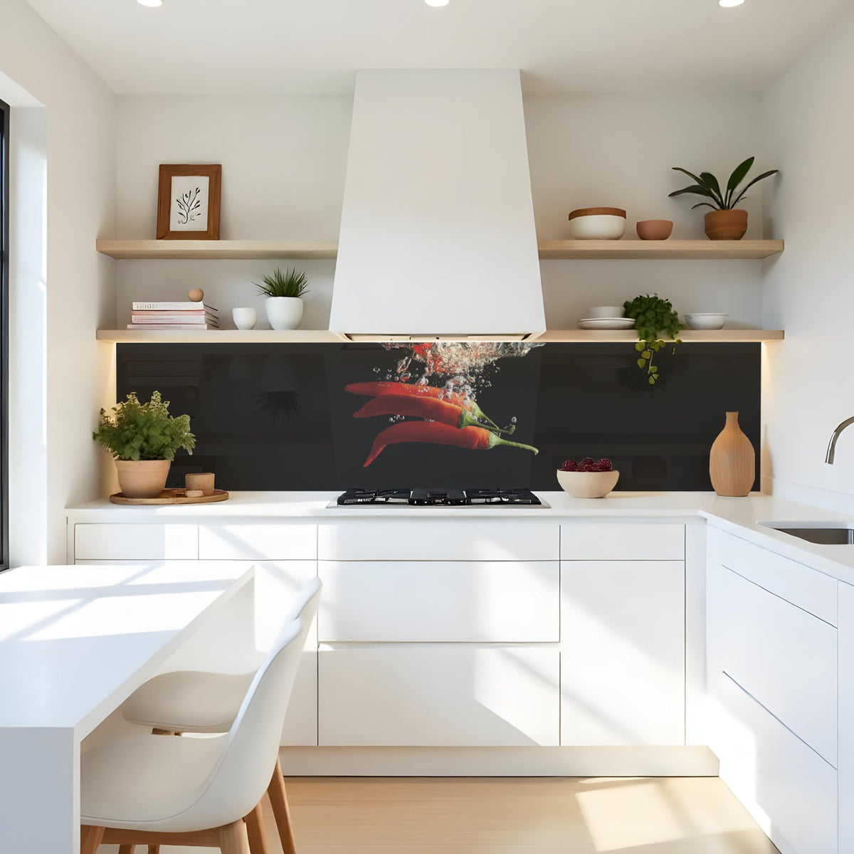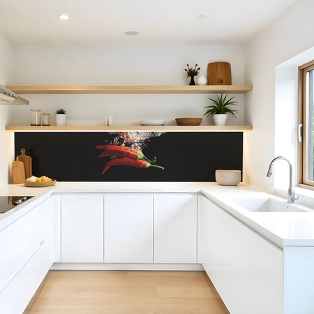Verleihen Sie Ihrer Küche mit der Küchenrückwand Frische Chili splash von Rueckwand21 einen stilvollen und modernen Look, der Ihre Persönlichkeit widerspiegelt. Passen Sie die Rückwand genau an Ihre Küche an – einfach Maße eingeben und den gewünschten Motivausschnitt auswählen – und schon ist Ihr neues Küchendesign fertig!