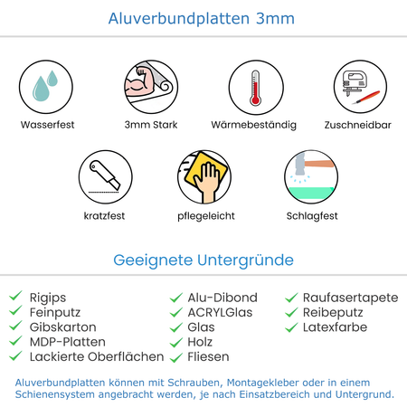 Die Aluverbundplatte ist 3mm Stark und ideales Material für Küchenrückwände, Duschrückwände und Spritzschutz. Dank ihrer Robustheit, leichten Handhabung und vielseitigen Designs bietet sie die perfekte Lösung für verschiedene Bereiche in Ihrem Zuhause.