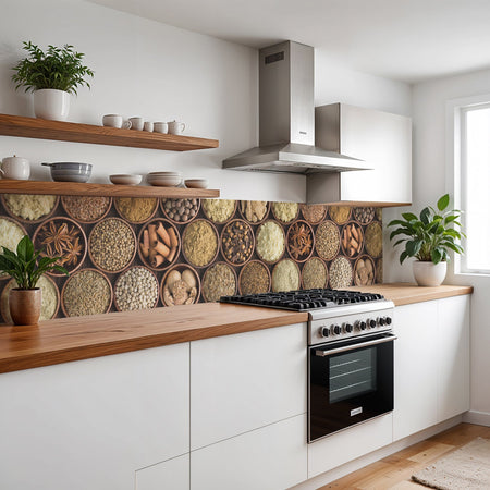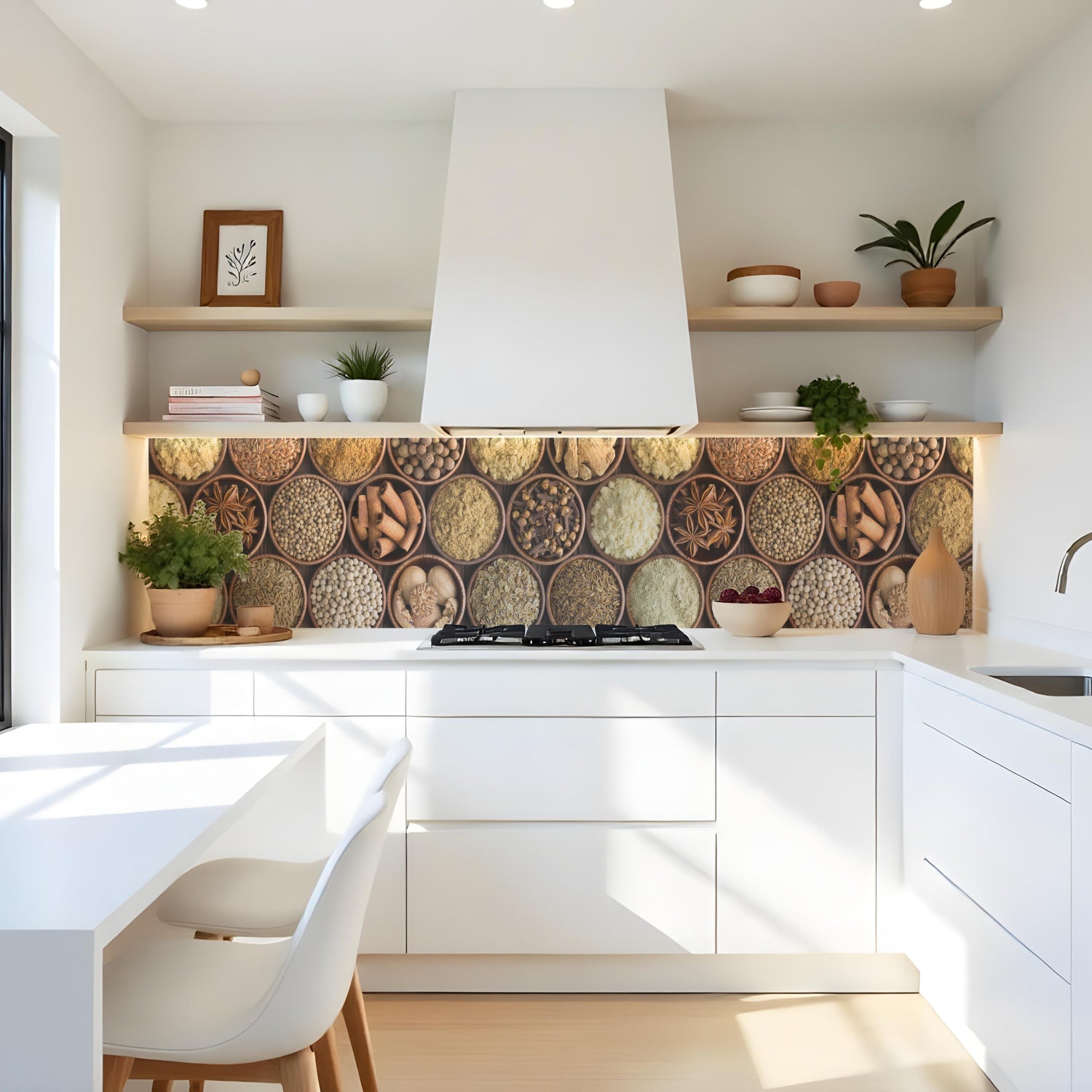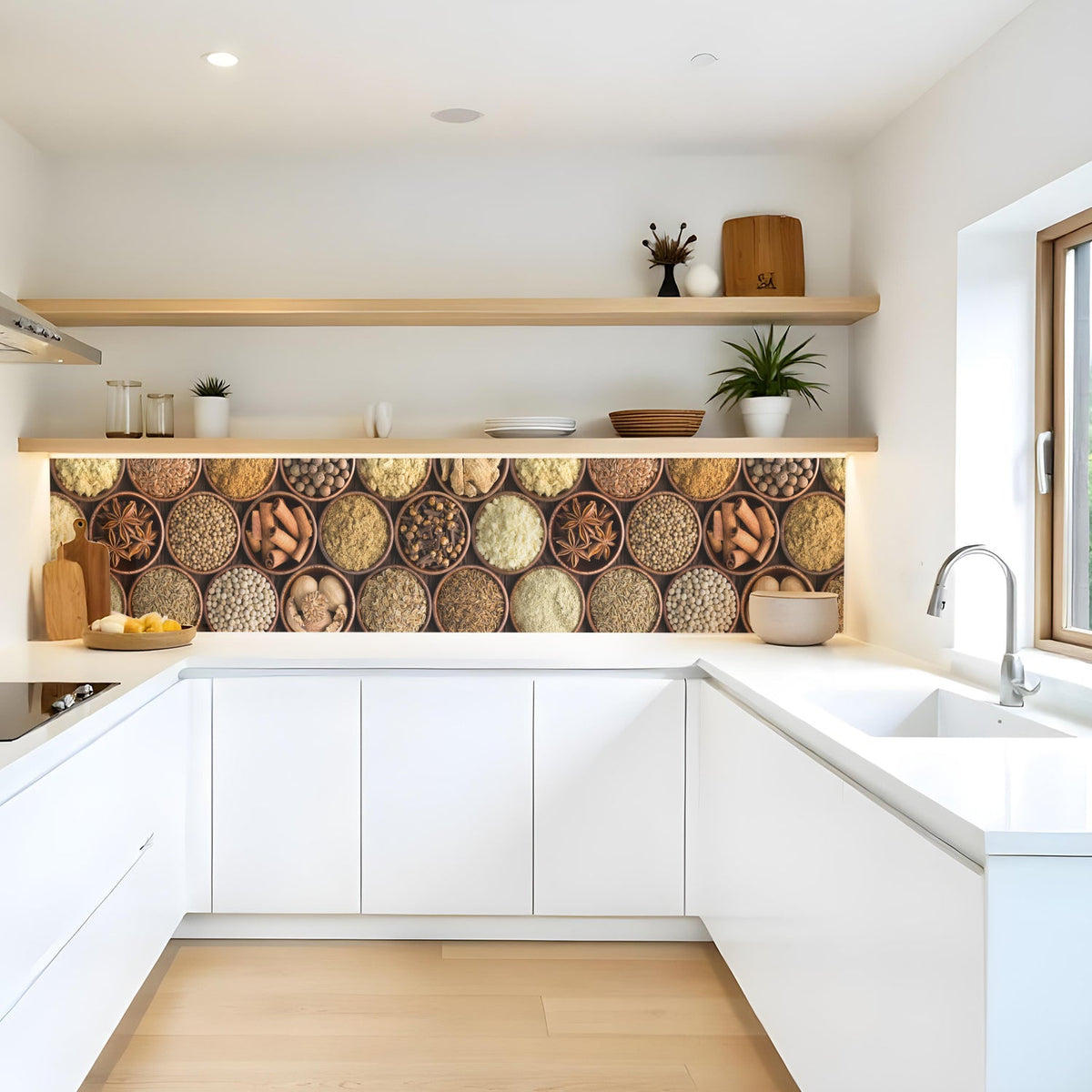 Verleihen Sie Ihrer Küche mit der Küchenrückwand Gewürze in Bechern von Rueckwand21 einen stilvollen und modernen Look, der Ihre Persönlichkeit widerspiegelt. Passen Sie die Rückwand genau an Ihre Küche an – einfach Maße eingeben und den gewünschten Motivausschnitt auswählen – und schon ist Ihr neues Küchendesign fertig!