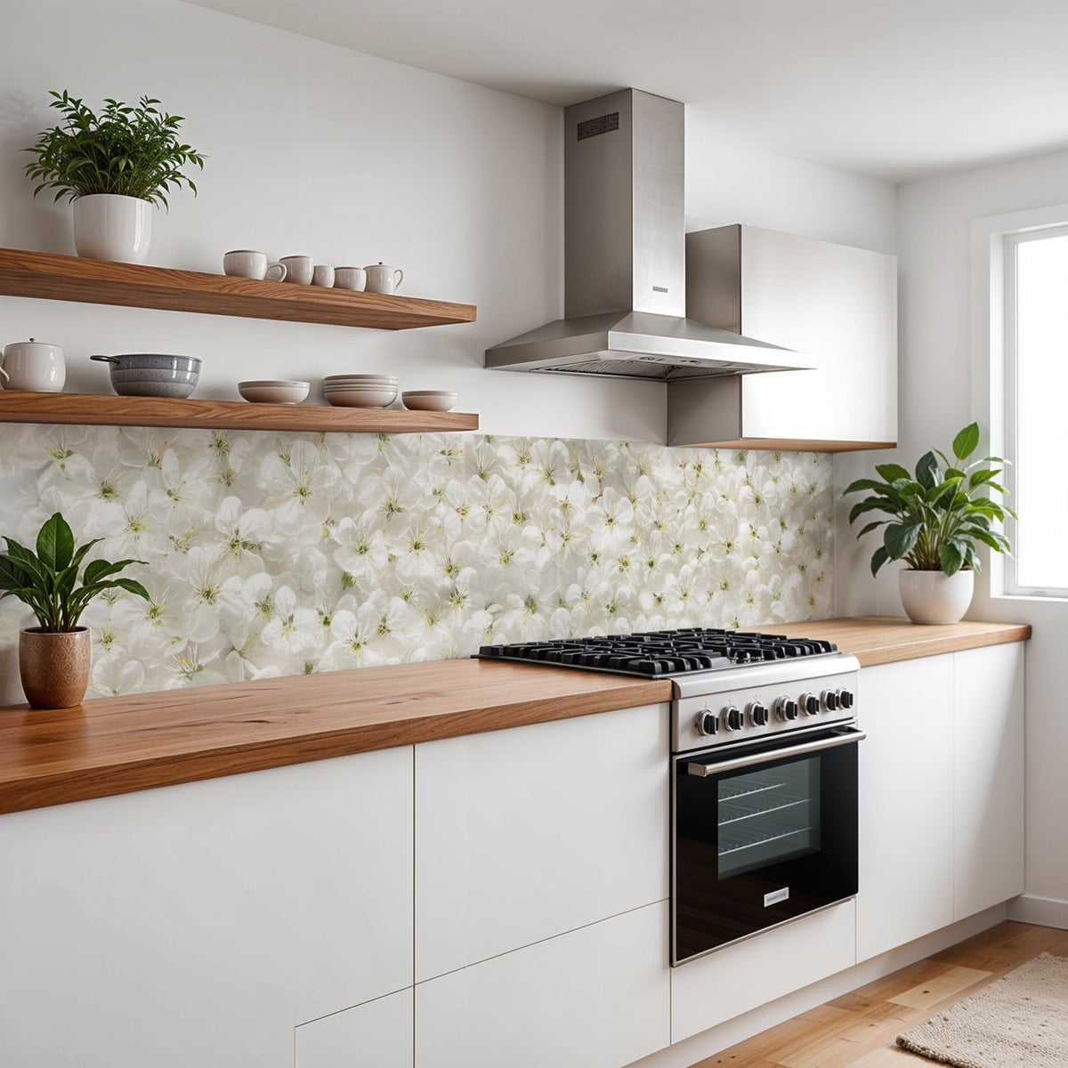 Verleihen Sie Ihrer Küche mit der Küchenrückwand Weiße Blumen von Rueckwand21 einen stilvollen und modernen Look, der Ihre Persönlichkeit widerspiegelt. Passen Sie die Rückwand genau an Ihre Küche an – einfach Maße eingeben und den gewünschten Motivausschnitt auswählen – und schon ist Ihr neues Küchendesign fertig!
