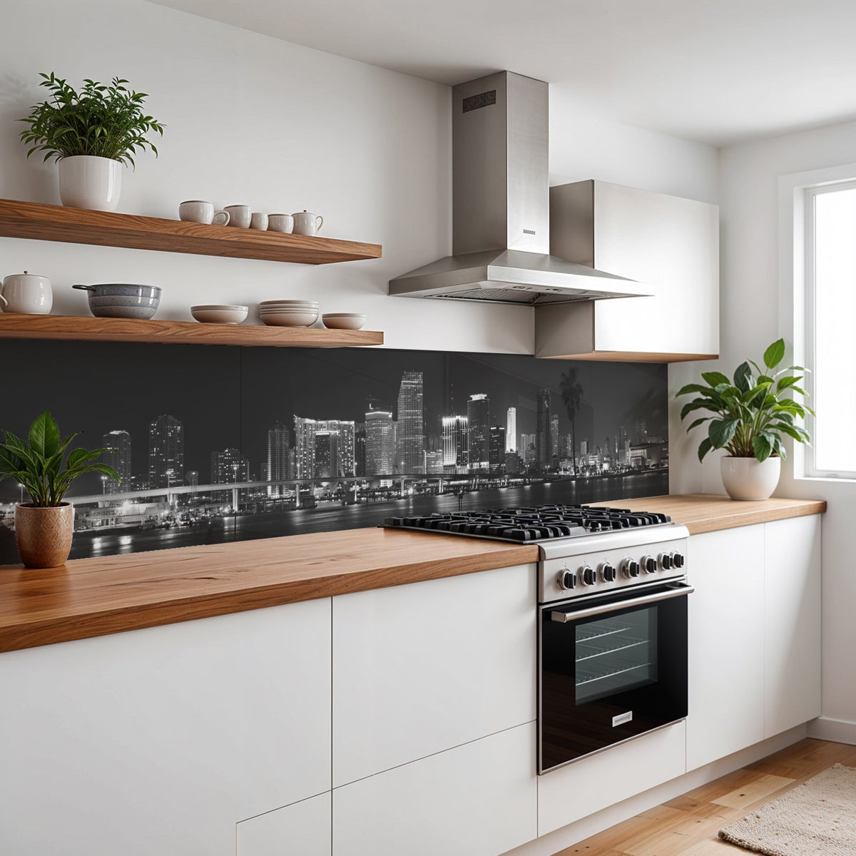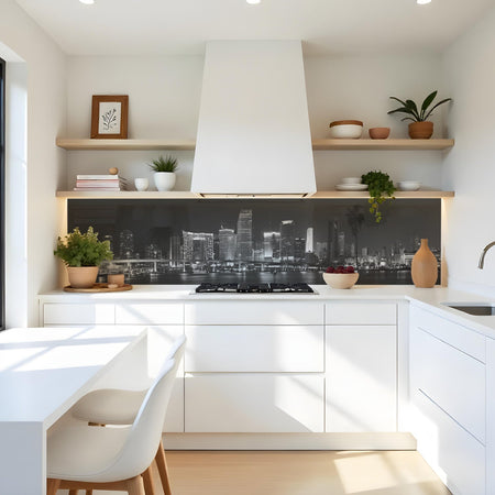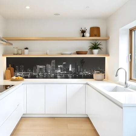 Verleihen Sie Ihrer Küche mit der Küchenrückwand Skyline Night Black von Rueckwand21 einen stilvollen und modernen Look, der Ihre Persönlichkeit widerspiegelt. Passen Sie die Rückwand genau an Ihre Küche an – einfach Maße eingeben und den gewünschten Motivausschnitt auswählen – und schon ist Ihr neues Küchendesign fertig!