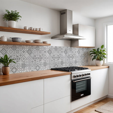Verleihen Sie Ihrer Küche mit der Küchenrückwand Ornament Patchwork von Rueckwand21 einen stilvollen und modernen Look, der Ihre Persönlichkeit widerspiegelt. Passen Sie die Rückwand genau an Ihre Küche an – einfach Maße eingeben und den gewünschten Motivausschnitt auswählen – und schon ist Ihr neues Küchendesign fertig!